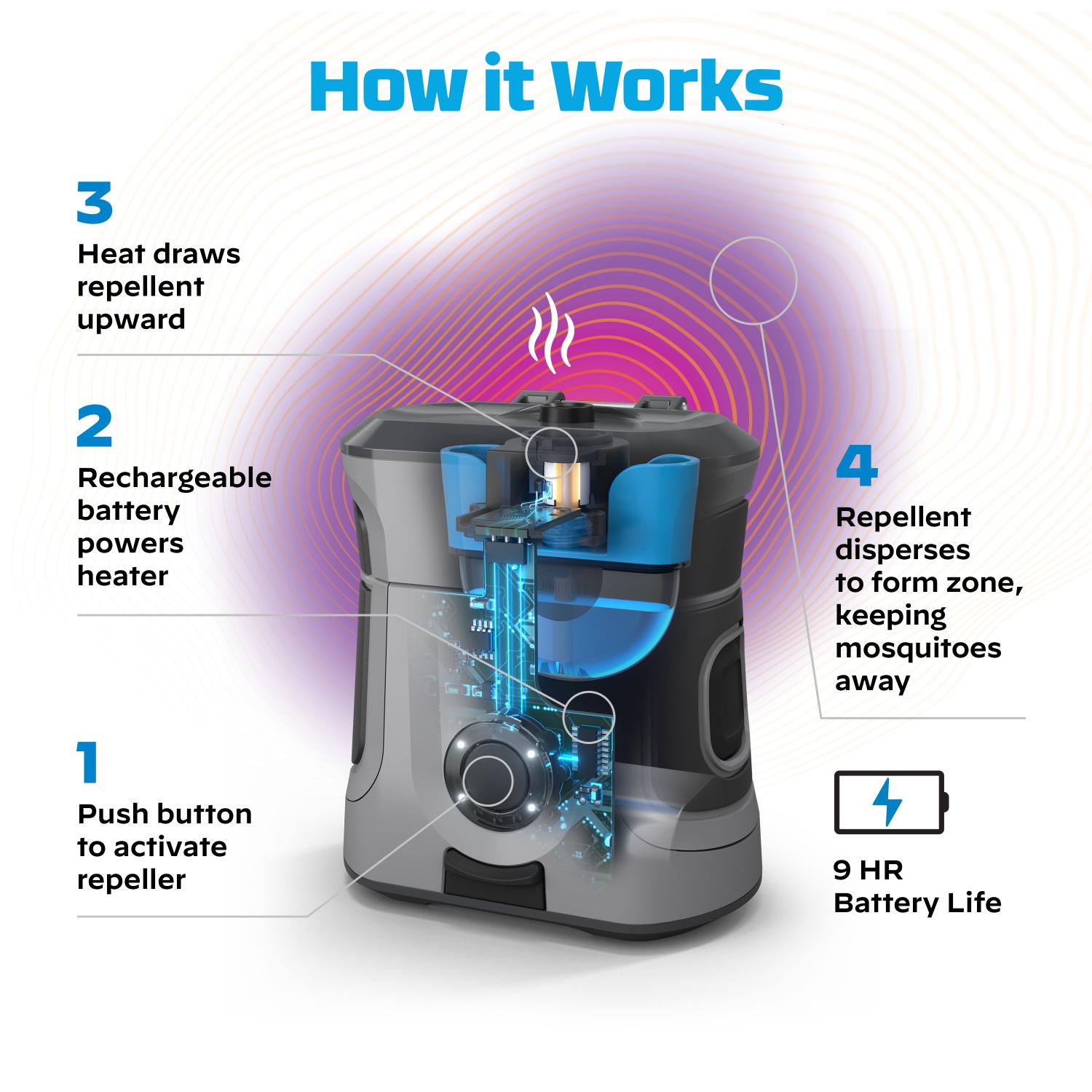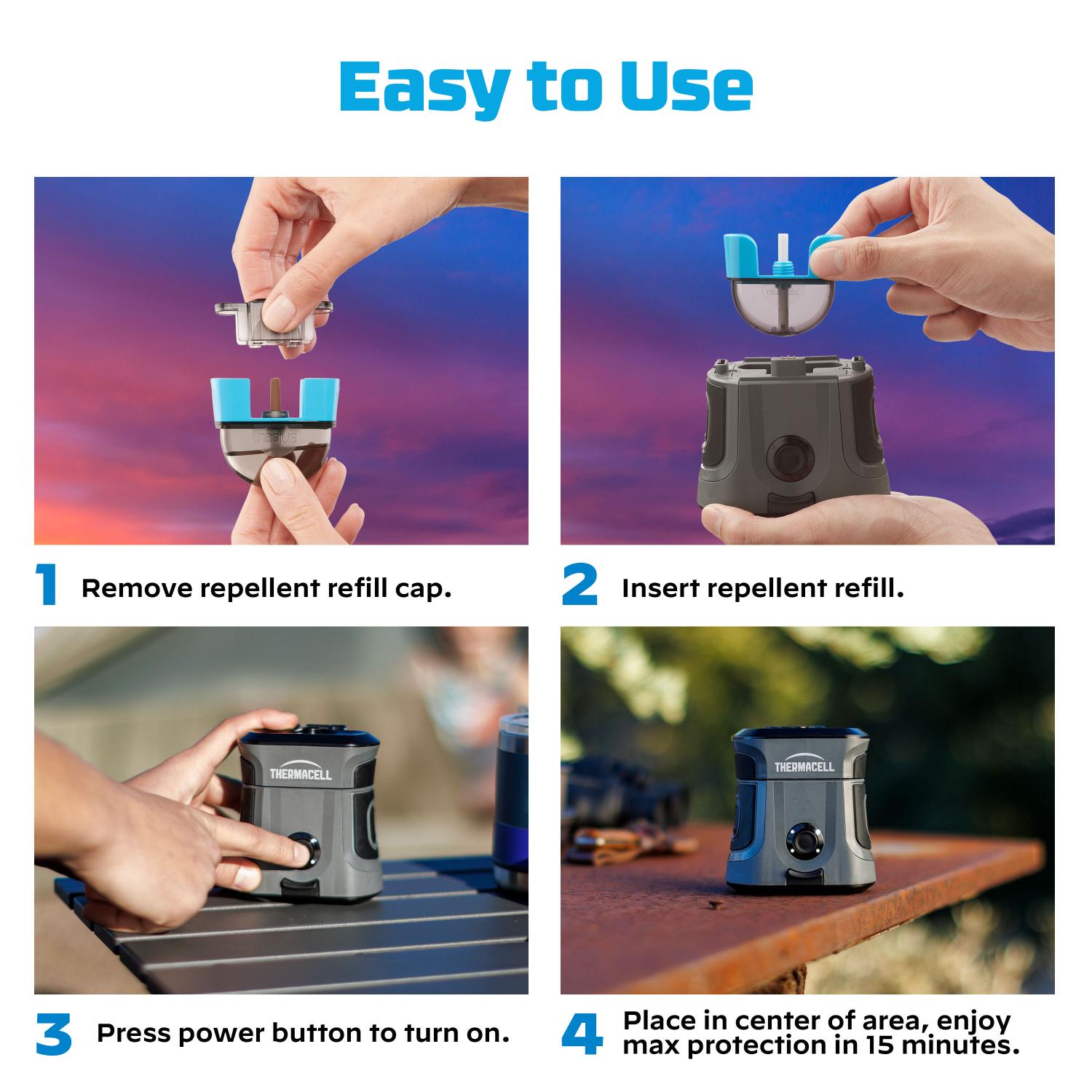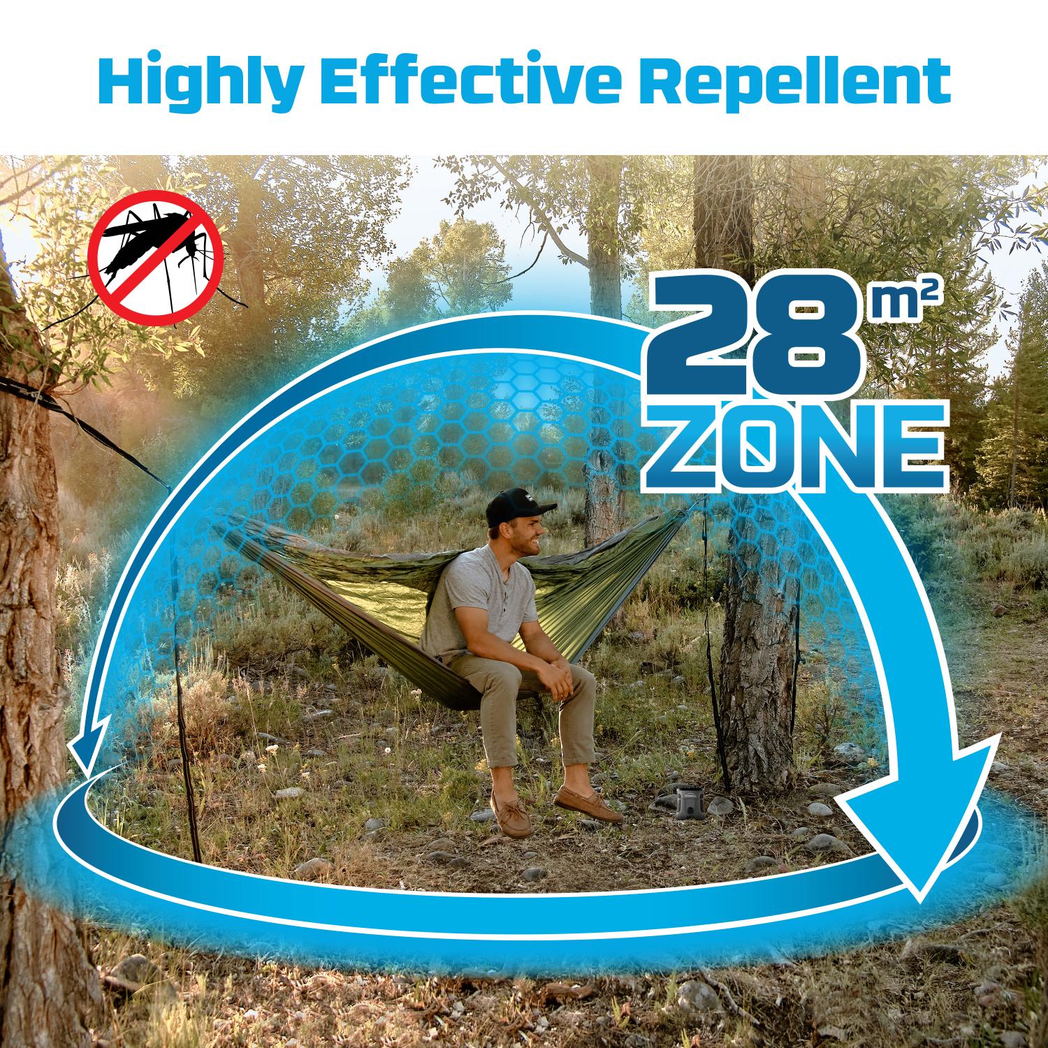The Thermacell EX90 is built to withstand the rigors of outdoor life, it’s your trusty companion on every adventure. Boasting a 9-hour battery life, the EX90 offers a 28m2 zone of advanced mosquito protection – our largest area repellent zone available! It features a rubber over-mold, an IP54 rating, audio cues, and LED status indicators. It is also air travel friendly. Whether you’re hiking, camping, fishing, or just having a backyard barbecue, this device is engineered to keep you mozzie free.